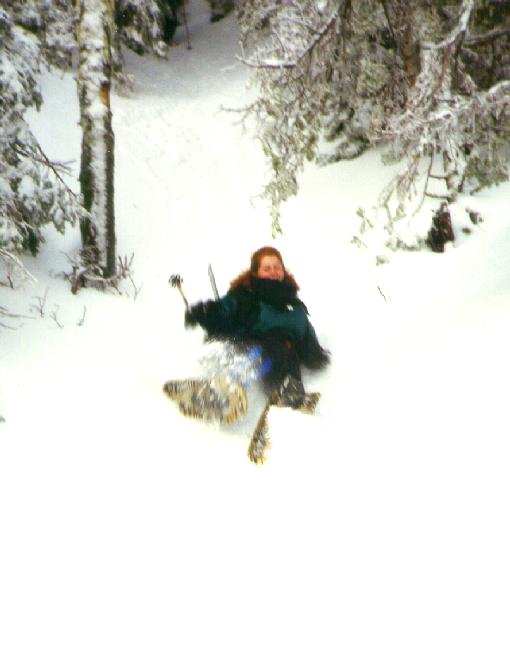 Below the lookouts, the trail dropped steeply toward the Jackson-Pierce col, providing several opportunities for glissade and self-arrest practice (left). Most people didn't bother with the self-arrest part, though, since windblown powder made for a nice soft slide through the woods. We arrived at Mizpah Spring tired, snow-covered, and hungry.