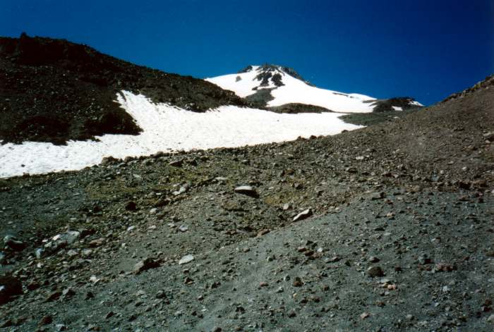 (I managed to get a little information from various internet discussion groups after returning to civilization. The rock route was "the source of all the rockfall" on the route, so I'm glad we didn't mess around with it. The upper Hotlum glacier was "a sheet of ice" with crevasses and a "gaping schrund" near the top. Allegedly, the standard route was simply steep and firm, although it got close to some sizable fissures near the top of the Wintun. I doubt we would have enjoyed that without at least a running belay. Also, examination of the various photos reveals that this route would have passed underneath the vertical wall of the Wintun bergschrund, which we could see from below but couldn't orient with the route itself, before hitting another section of mandatory rock.)