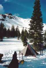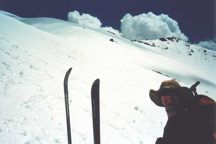 Then, as the sun warmed the snow, the skin problems began. I'd recently purchased a set of full-width Ascensions for my new telemark gear, and so I had fresh glue, edge-to-edge coverage, and the kind of climbing security that is the signature of "Climbing Purple Vertical Eaters." Paul's 55mm Euro-tip skins were light on glue, stretched when wet, balled up tons of snow, and wouldn't bite in a steep, firm skin track. Anyone who's struggled with substandard skins knows the frustration of sudden releases, sideways sliding, and frequent falls. Add an expedition pack and difficult terrain to create the perfect skiing nightmare.