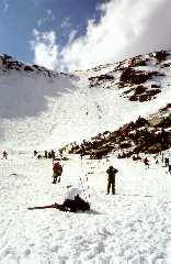 ![]() Another fine day? Fog and drizzle clear by noon, giving us a four-hour window of opportunity. Mark Renson, of SKIVT-L list fame, takes the first of several runs in the sweet corn of Left Gully. Crevasses and undermined snow keep The Lip off limits to all but the most daring and foolish skiers.