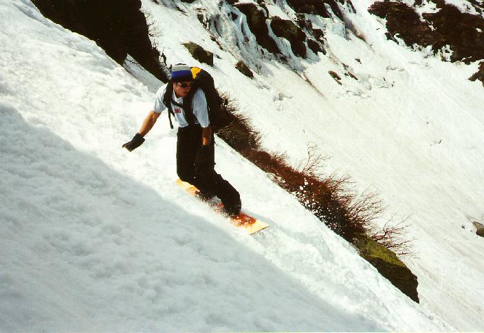 ![]() Beware! Falling Ice! Paul surveys the remains of recent icefall in the Bowl without actually putting himself at risk. The Octopus was not as lucky. A boarder shows how it's done as he exits the bottleneck of the Chute. The real highlight, though, were three boarders who left perfect figure-eights cross the Sluice. That they did it naked made it an even more impressive feat.