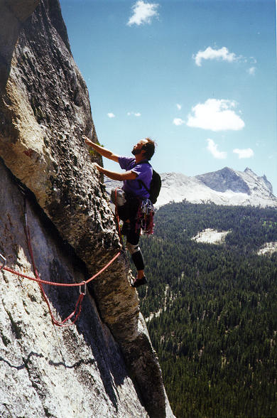 The Dike Route starts with relaxed 5.6-ish slab climbing following a right-moving dike; hence the name. The route continues up for several pitches, getting continuously steeper as it rises, and the last section has some 5.9 moves. At this point, I was still deathly afraid of my new Aces, so I was wearing my trusty, but beat-up Zephyrs. The route went quickly - Karl can climb like a madman, and the climbing was well within my ability, so before we could blink, we were at the top. The climb itself was tasty, and well worth its three star rating. The continuous increase in difficulty made for a delightful warmup, and a great introduction to the thin granite climbs which Touloumne has in bundles. When I arrived at the top, Karl commented on the speed with which we'd climbed these pitches. It seemed to start his mind stirring, but I wouldn't find out until later what seeds it had planted.