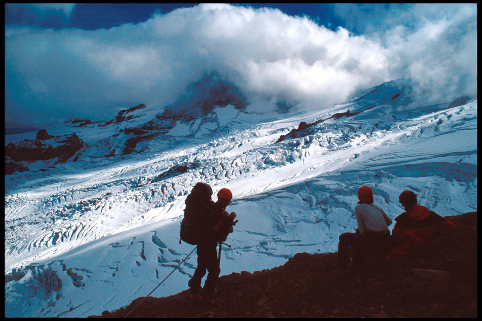 Our first foray onto Emmons Glacier took us over a huge snow bridge. The massive overhang was not visible until after the crossing.Yes Hector, there is air directly under you.