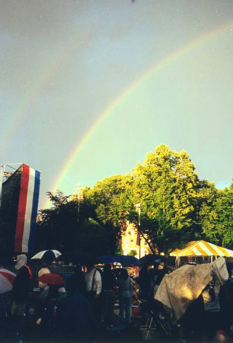 A rainbow marks the end of a pre-Pops thunderstorm. Sleet in July?