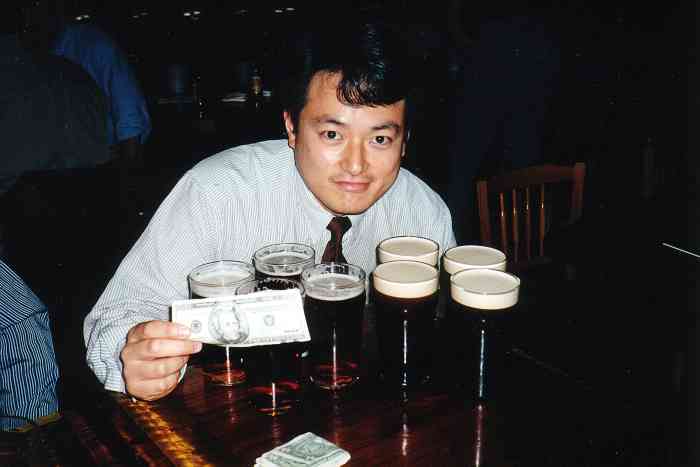 Brian Chen, me, Paul Huibers, Yoshi Uchida, owner Pam Beale, barmaster "Geo", and Simon Karecki prepare to close out our local.