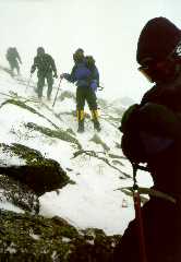 We tried again two weeks later, with only myself, Scott Fitzgerald, Paul Rozelle, and The Octopus going back for more. Once again, we were on the backside of a storm system, and this one had dumped a significant amount of snow on top of a week-old rain crust. Each stab of an ice ax revealed multiple layers within the snowpack, and we even saw fracture lines across several moderate slopes near the summit. The blowing snow was our worst problem--however, in the Gulf of Slides, two skiers didn't heed the warnings and were caught in an avalanche.